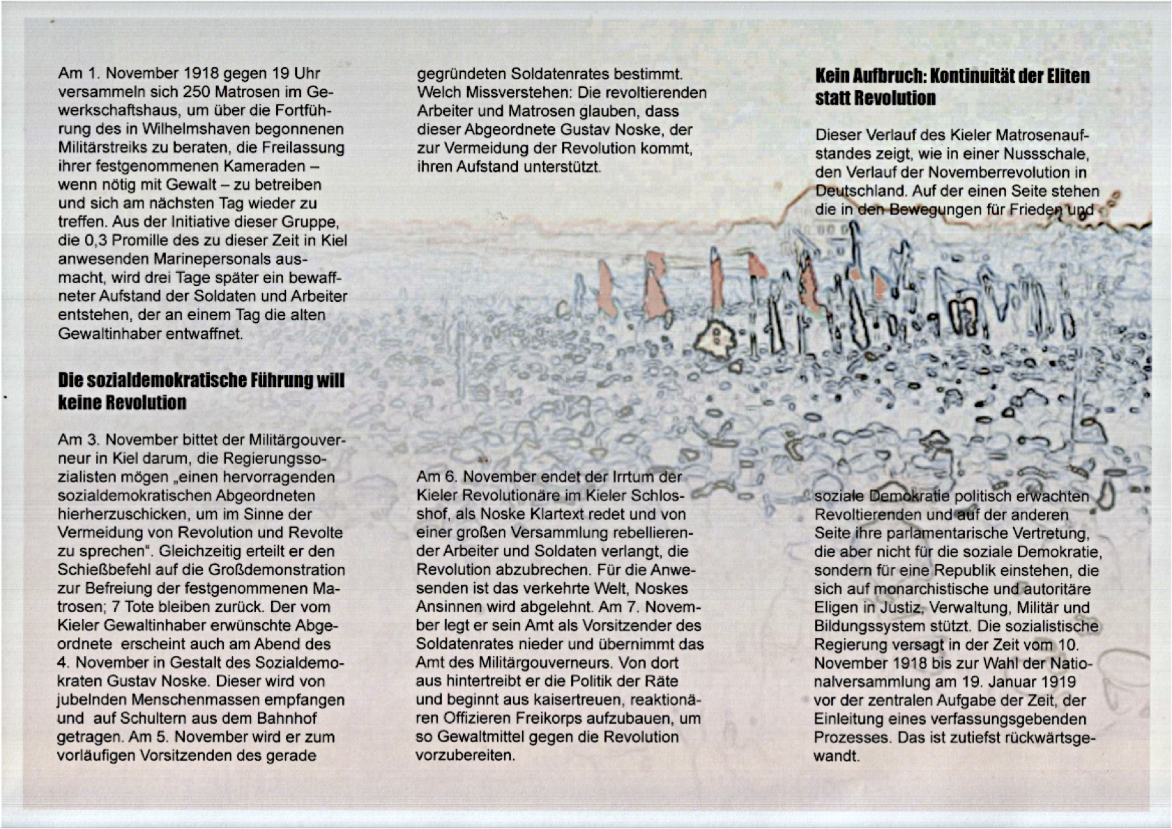 " Festveranstaltung zum Jubiläum vom Kreisverband Die LINKE unter dem Motto Eine starke Demokratie braucht eine starke Linke. Wenn die Stad Kiel heute den Kieler Matrosenaufstand zu Recht als Aufbruch zur Demokratie feiert, so feiert sie eine Revolution, die nie zu Ende geführt wurde. Die demokratische Massenbewegung hätte eine stabile Demokratie errichten können, aber die Chance wurde vertan: Der Kaiser ging, die Generäle blieben. - Thomas Herrmann und Bernd Zöllner, beide Historiker, führen in ihren Vorträgen durch die bewegten Zeiten von 1918 bis 1920 und werfen dabei einen Blick auf die Hintergründe. Was geschah in Kiel in den Tagen vom 1. bis zum 7. November?, das ist die Ausgangsfrage der Vorträge, danach werden eine Reihe von Aspekten angesprochen und zur Diskussion gestellt. Weitere Information zu dieser Veranstaltung finden Sie hier.